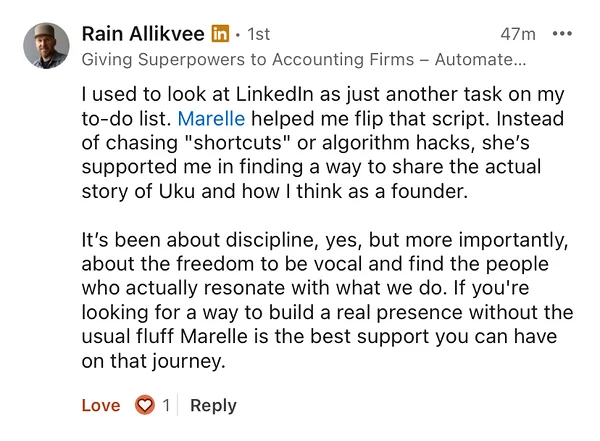 Today, I use that same system to help others achieve real results. Over 400 people have already taken part, with overwhelmingly positive feedback. I’ve also trained some of Estonia’s biggest brands, including Bolt, Bondora, LHV, SEB, Swedbank, and MyFitness.I believe in sincerity and authenticity, both online and in life. This challenge is designed to help you find your story and share it confidently – even if you’ve felt unsure or hesitant before.